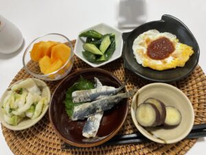 半熟卵目玉焼き 鰯オイルサーディン 還元塩オイルレモン 還元糠漬け ポテトサラダetc
