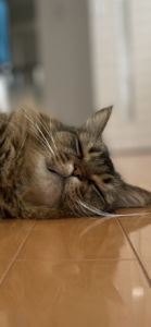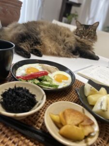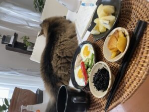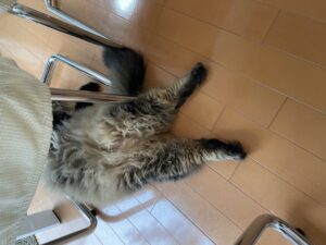 朝食を食べながら、足元をのぞくと笑えるくらいのリラックスしたまるさんが愛おしいです。
