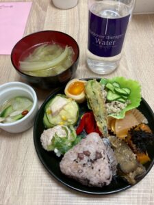 無農薬ポテトサラダ、ひじき煮、糠漬け、米粉夏野菜フリット、鶏ハム、チキンフリット