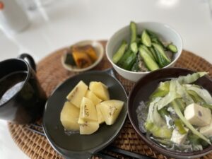 ニンニク生姜 蓮根シュウマイ 還元糠漬けきゅうり かぼちゃ蒸し シイタケ ゴボウ オクラ米粉揚げ